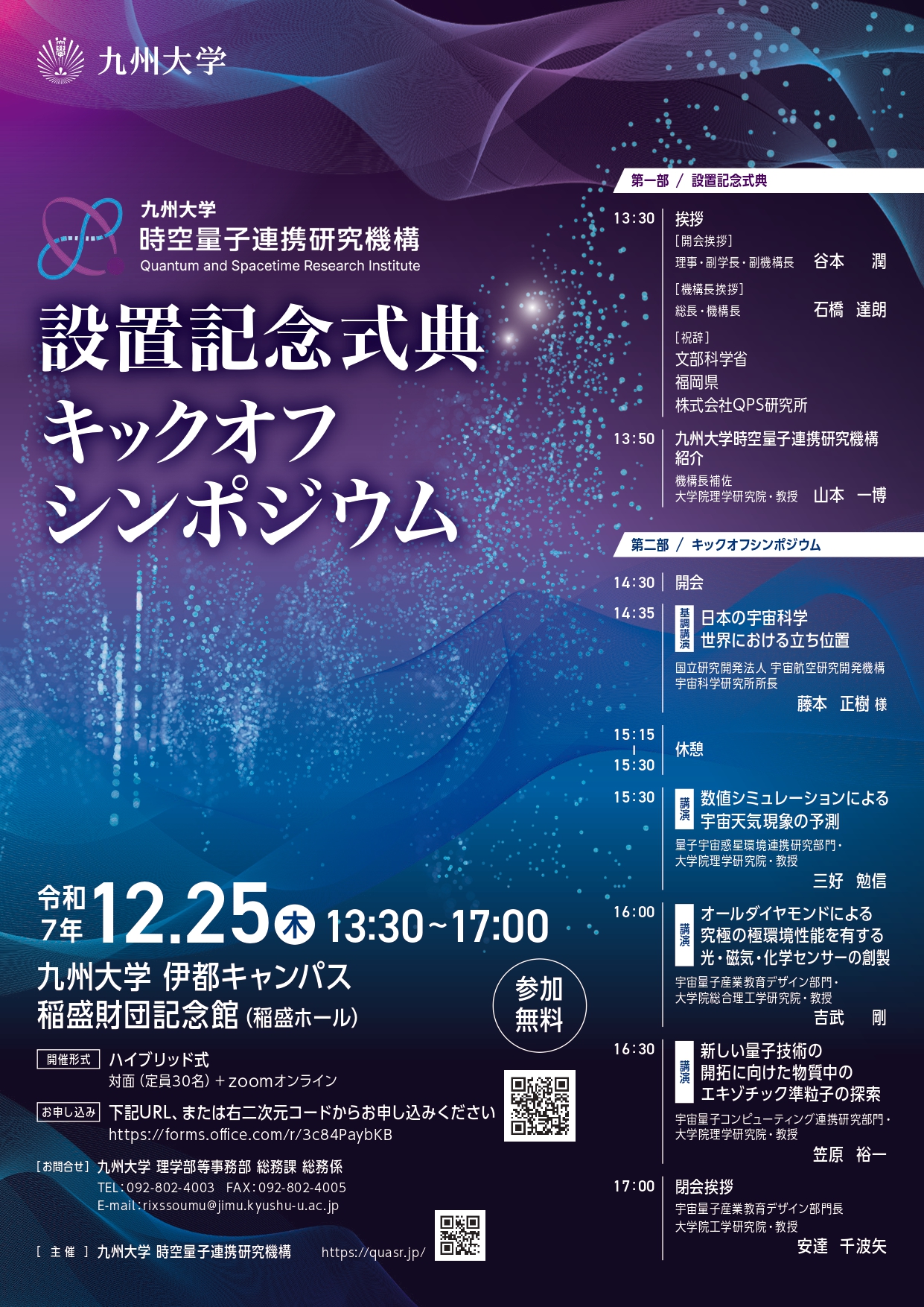 Kyushu University established the Quantum and Spacetime Research Institute on October 1, 2025. This institute aims to pioneer new academic frontiers and foster innovation by integrating space and quantum science, serving as a platform for interdisciplinary collaborative research.